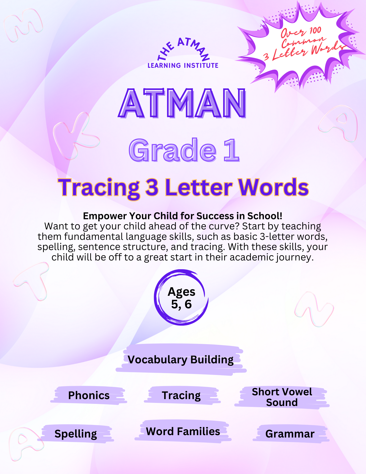 Learn: Tracing, Grammar, Vocabulary Building, Usage, Spelling, Phonics, Word Families, Short Vowel Sound
